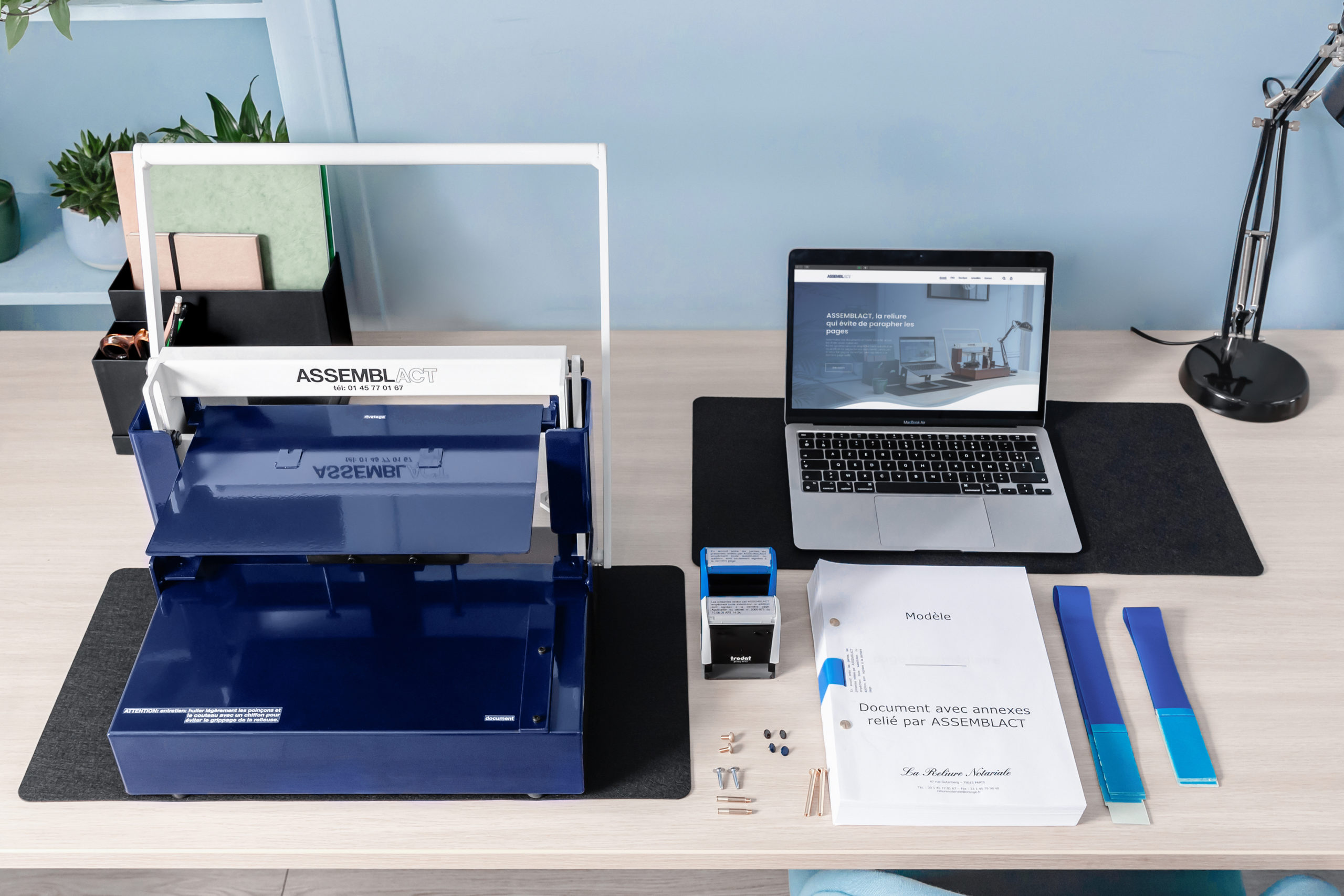 La relieuse Assemblact® exécute avec précision la perforation de 50 feuilles à la fois, et le rivetage c’est à dire le fait d’assembler vos documents papier à l’aide de rivets, de manière durable.