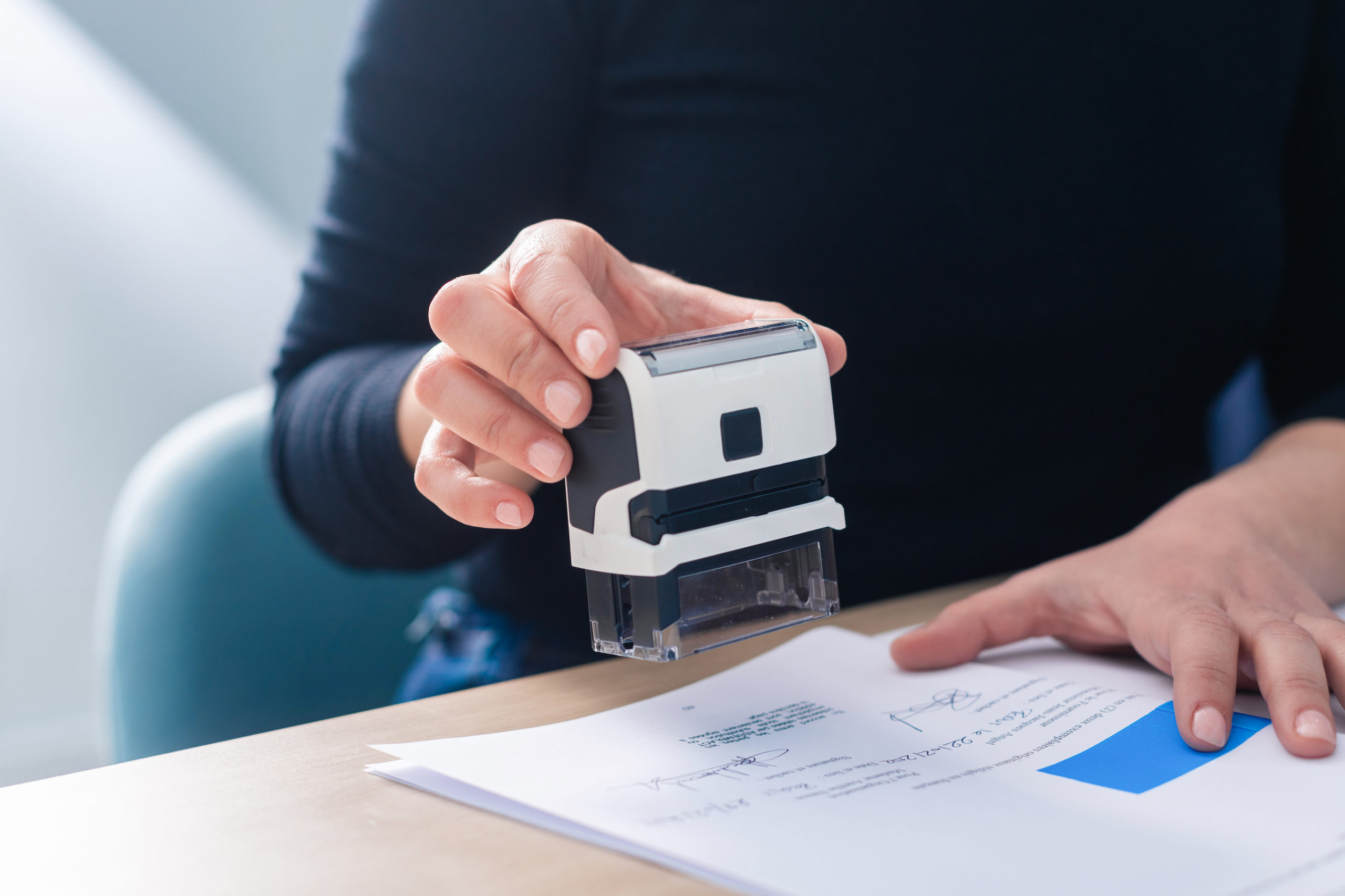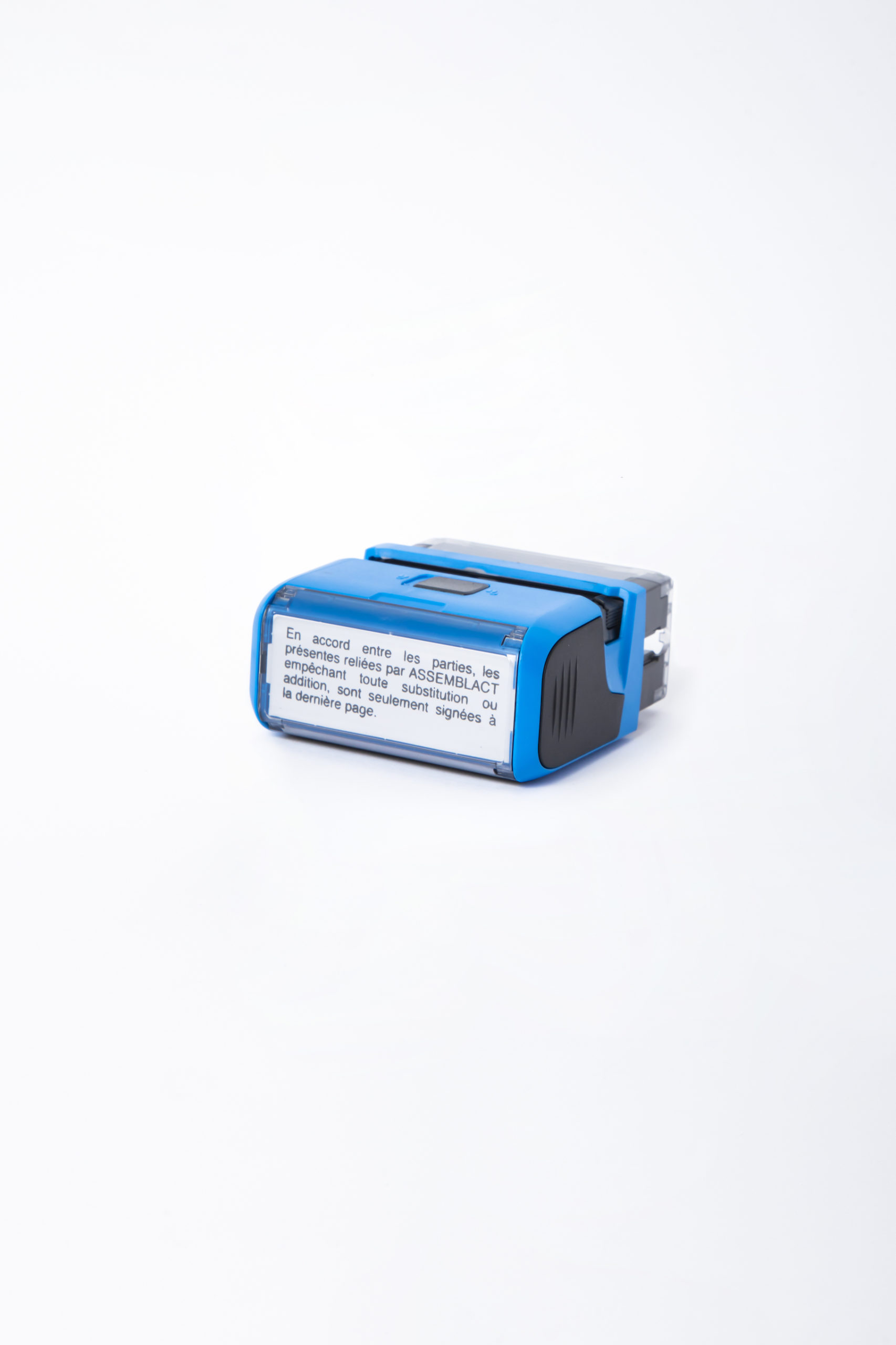 Le tampon auto-encreur Trodat indique l’utilisation de notre système de reliure Assemblact® empêchant toute substitution ou addition de pages, conformément à la législation.